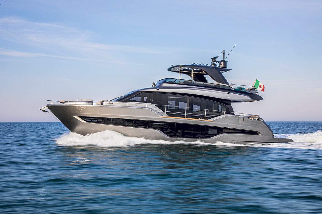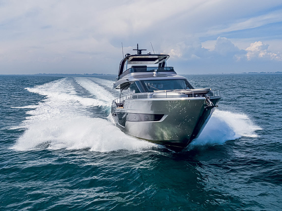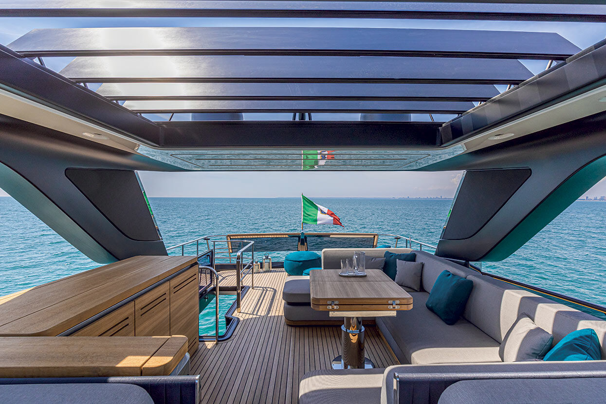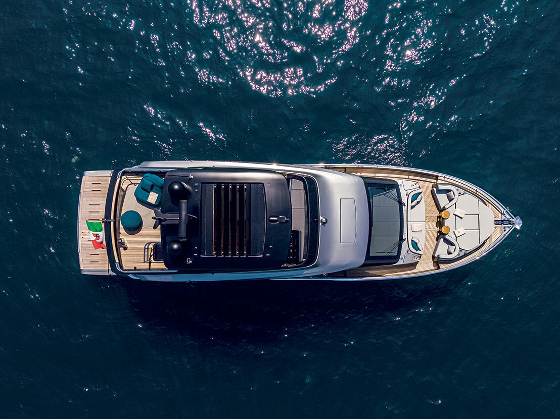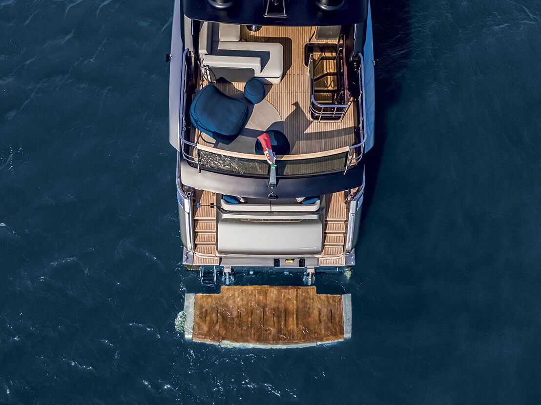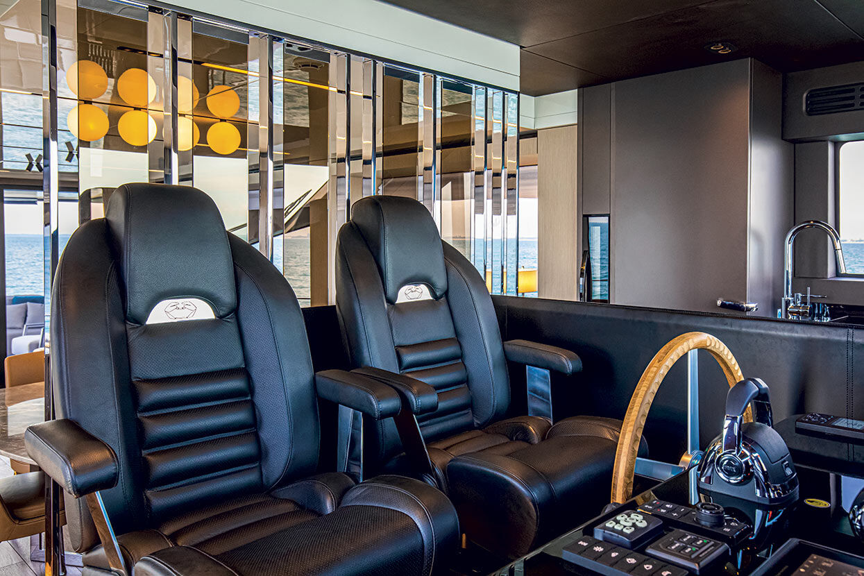 Il pozzetto offre un’area lounge e, salendo la scala, si raggiunge l’area living del flybridge, uno spazio comodo ed elegante per pranzare o rilassarsi. Verso poppa si apre una grande terrazza, da allestire con lettini e chaise longue. A prua si trova invece la plancia di guida del fly, da cui si gode la migliore visuale sul mare. Il cruscotto è avveniristico, minimale ed elegantissimo, con estetica e funzioni ispirate al settore automotive e capace di dare facile accesso a tutti i comandi necessari alla navigazione, al controllo e alla gestione dello yacht.