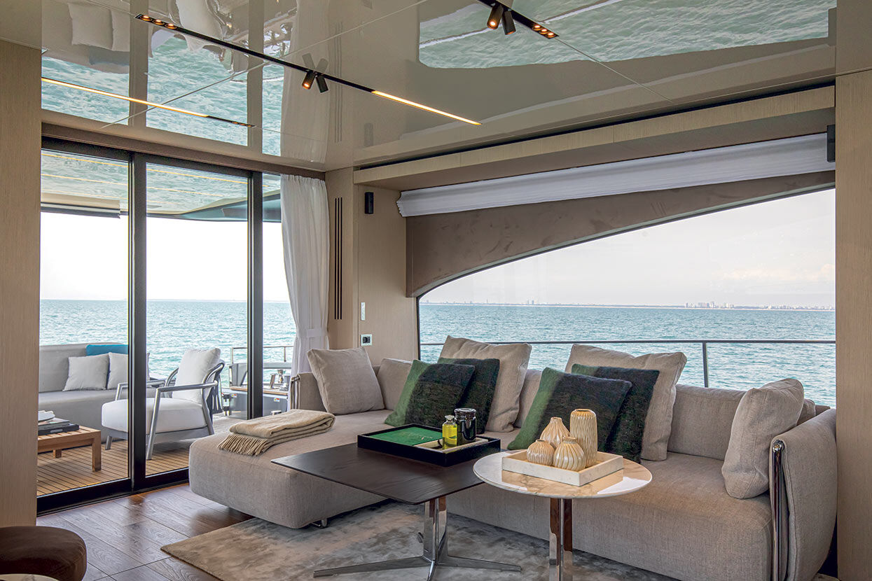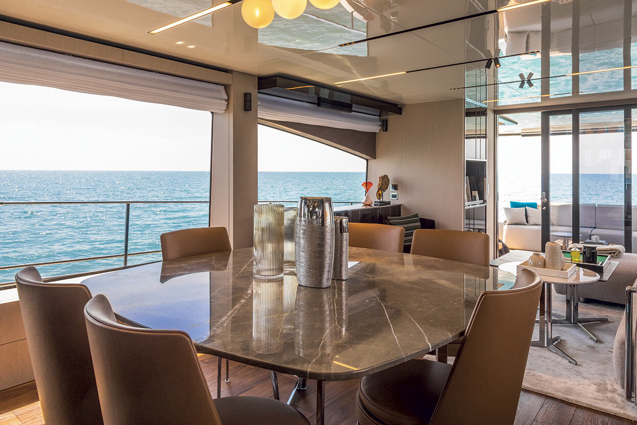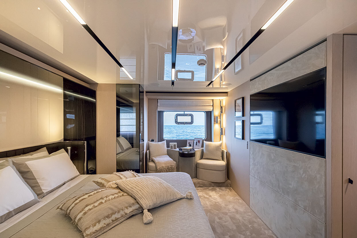 Il salone è personalizzabile e crea un elegante open space che comprende la cucina attrezzata e il locale timoneria, dove il posto di pilotaggio centrale garantisce una visione ottimale e la console dispone dei sistemi di navigazione, domotica e intrattenimento più all’avanguardia.