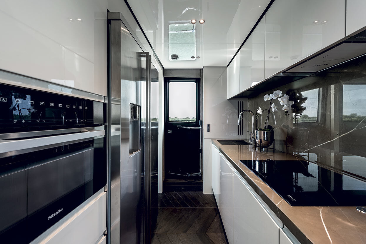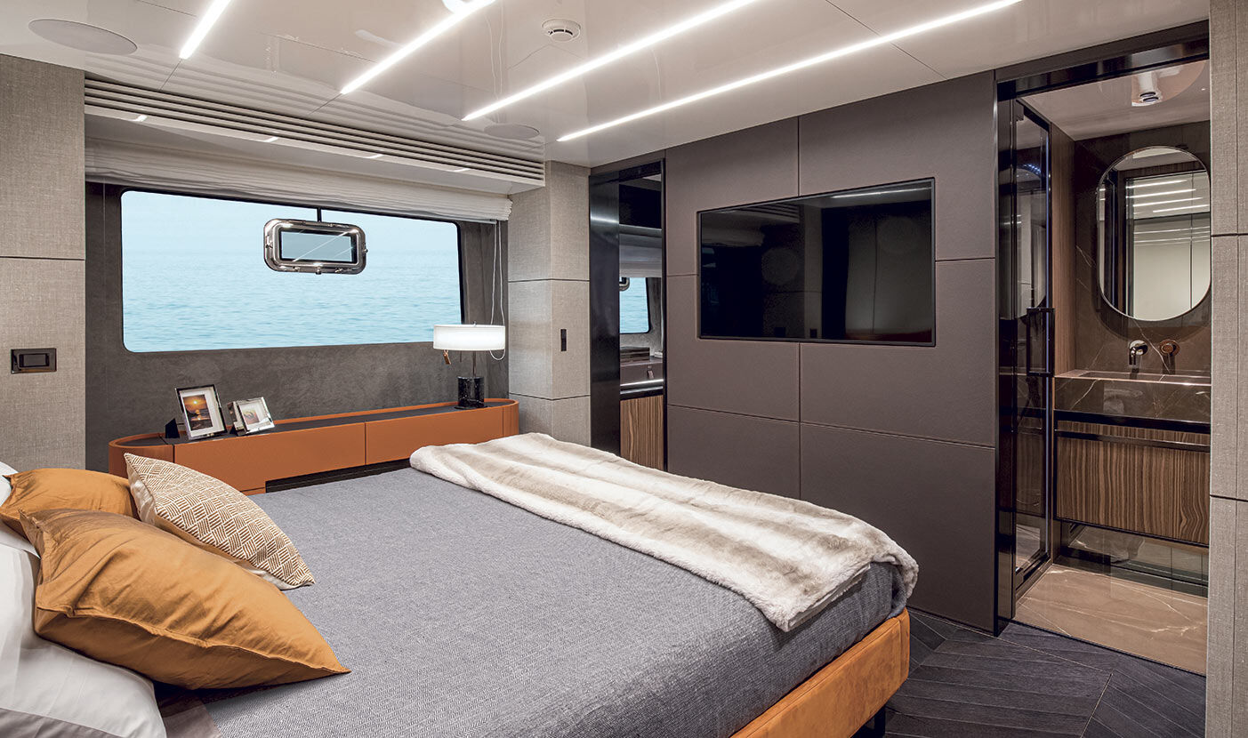 Il layout sottocoperta prevede fino a quattro cabine con bagno privato, arredate con materiali di pregio che esaltano la sensazione di comfort e lusso a bordo. La cabina equipaggio è dotata di due cuccette, bagno con doccia separata e lavanderia.