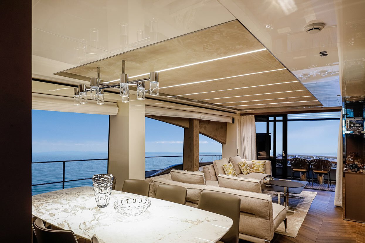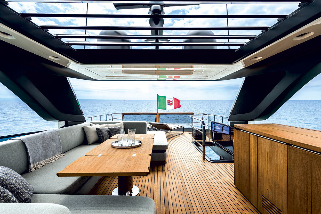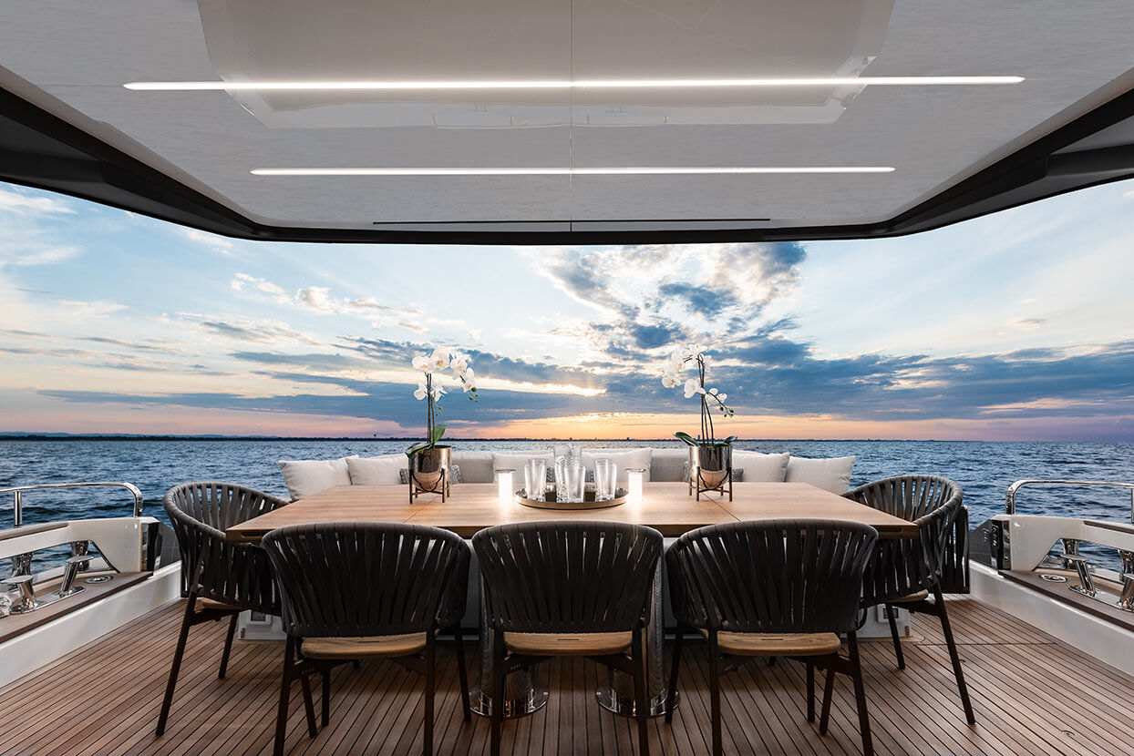 Sul main deck e sul fly, lo yacht offre grandi spazi all'aperto, con aree dedicate alla convivialità e al relax sia a poppa che a prua. La plancetta, raggiungibile in modo sicuro e agevole, è dotata di un lift che le permette di alzarsi e abbassarsi e di traslare in avanti, per diventare un'immensa terrazza sul mare.