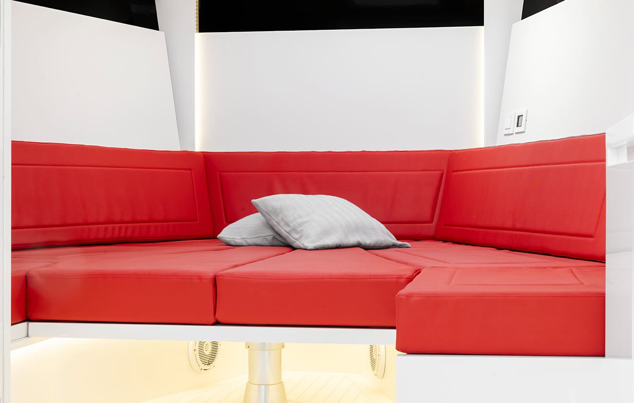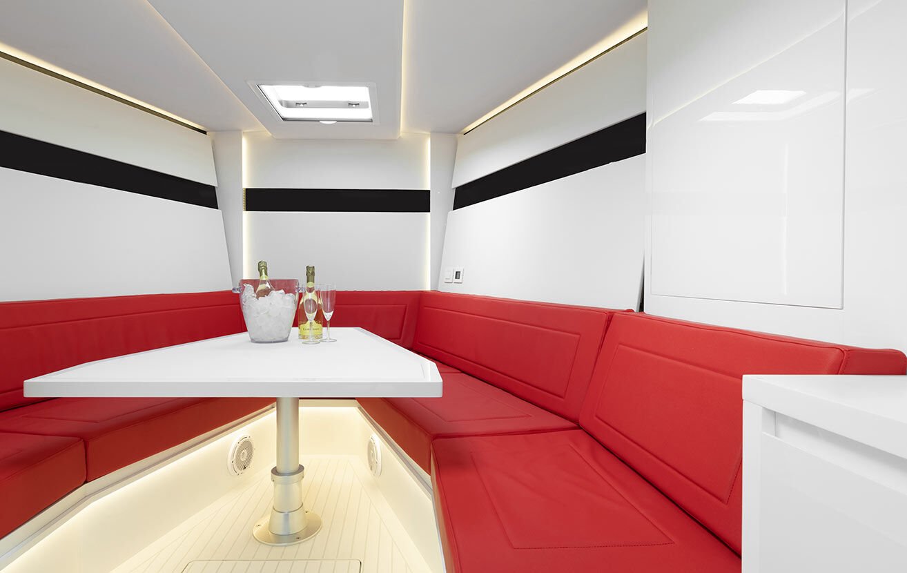 Gli interni presentano due versioni, entrambe dotate di bagno separato con box doccia: la “Lounge” offre un divano a U a prua, completato da un tavolo abbattibile trasformabile in letto, e un angolo relax verso poppa con divano e televisore; la versione “Sleep” propone un letto matrimoniale a prua e una cabina con due letti singoli verso poppa.