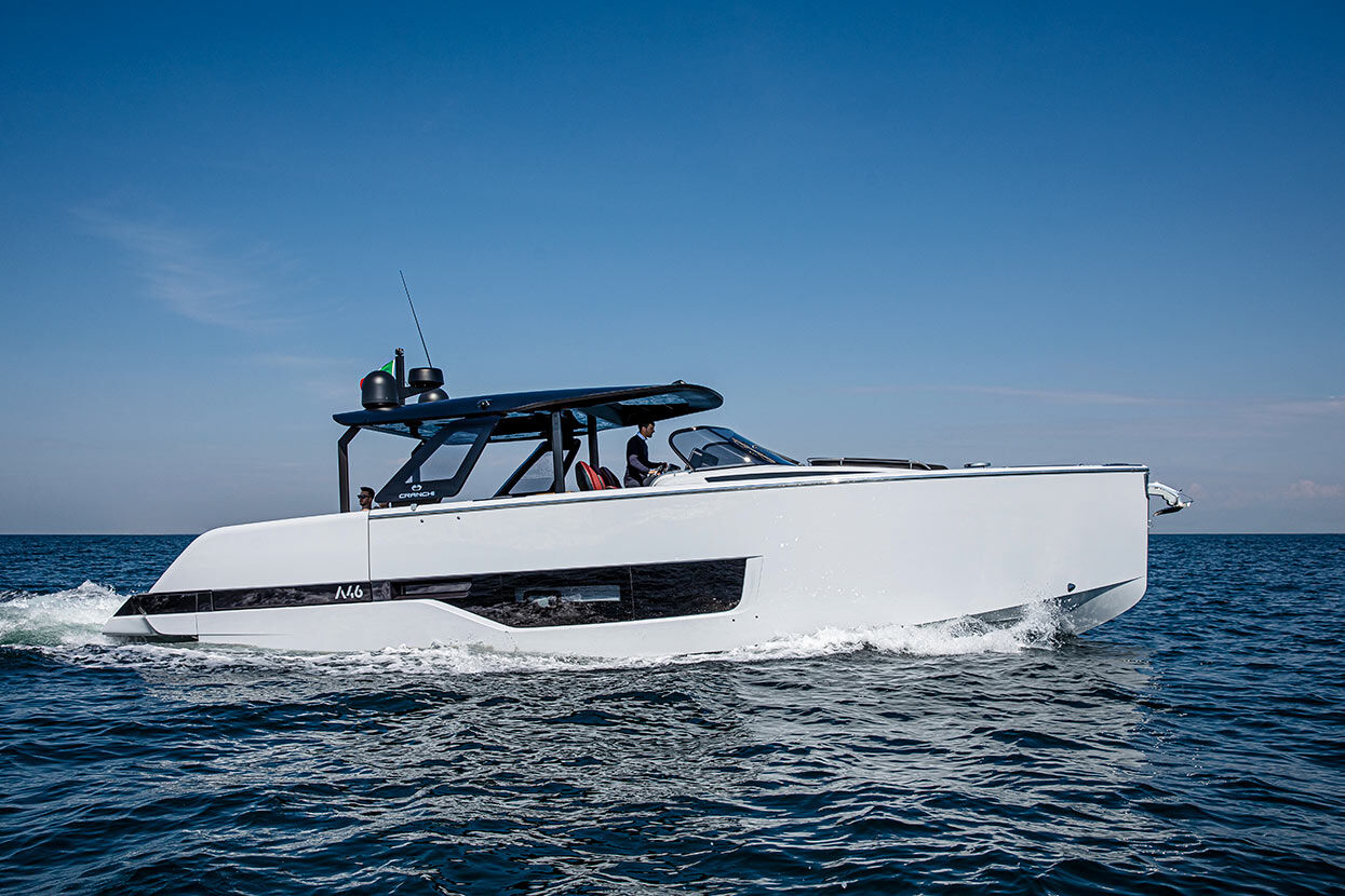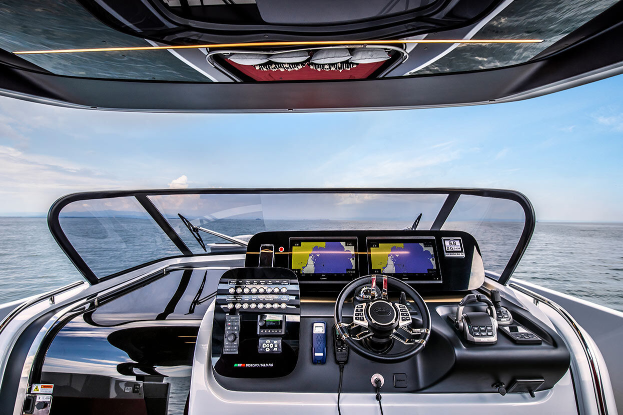 Das Armaturenbrett verfügt über drei Pilotensitze und eine große Steuerkonsole, ist durch die Windschutzscheibe und das einzigartige T-Top aus Karbon geschützt, das mit einem Blade-System ausgestattet ist, das das Öffnen des Daches in Sekundenschnelle ermöglicht.