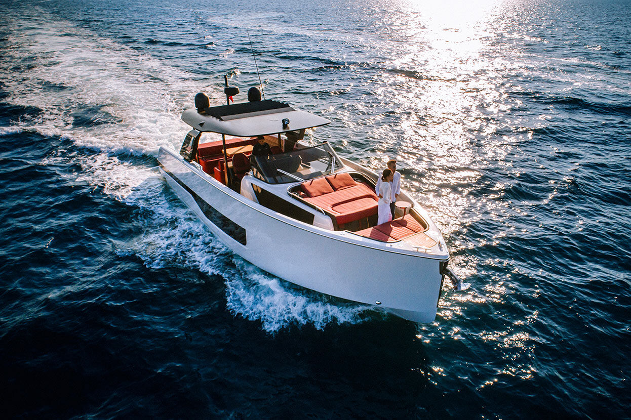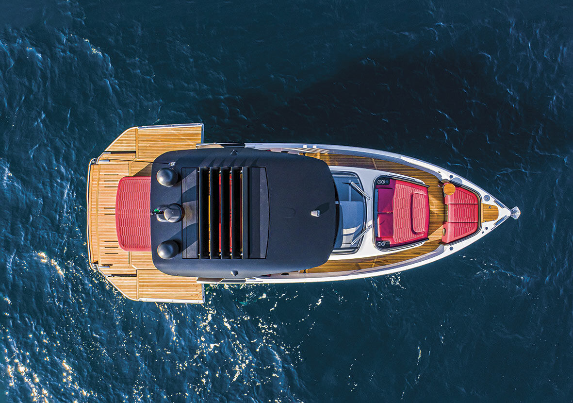 Am Heck öffnen sich die Flügel auf beiden Seiten des großen Sonnendecks mit einem servoelektrischen Mechanismus, um eine Terrasse von mehr als 5 Metern in Kontinuität mit der Cockpitoberfläche zu schaffen. Unter dem hinteren Sonnendeck befindet sich die Tendergarage.