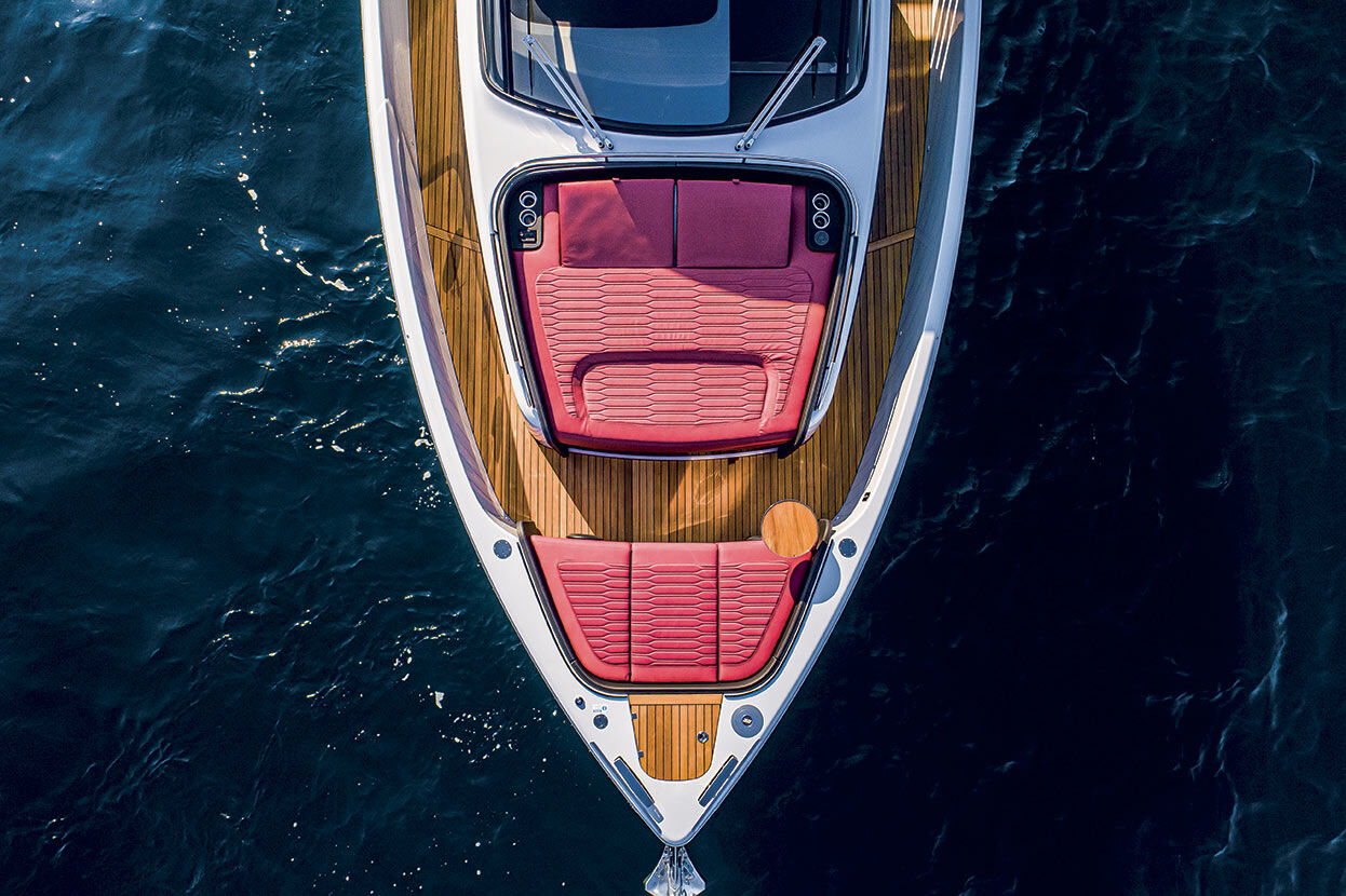 Im Bug befinden sich ein zweites Sonnendeck und ein Sofa mit Kühlschrank und verstellbaren Tisch, um einen weiteren komfortablen Lounge-Bereich zu schaffen.