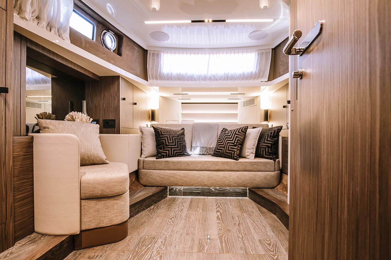Die Räume unter Deck bieten elegante, wandelbare Lösungen, die äußerst funktional sind. Die Dinette kann in einen Schlafbereich umgewandelt werden, der zusammen mit der komfortablen, durchgehenden Achterkabine das Übernachten an Bord erleichtert. Das Badezimmer aus Marmor ist mit einer separaten Duschkabine ausgestattet.