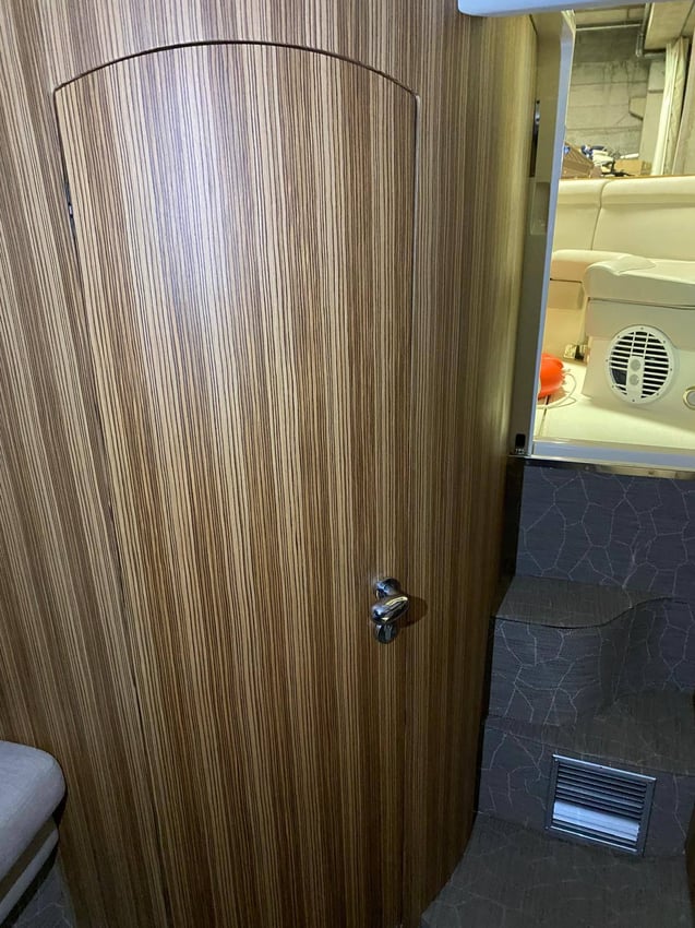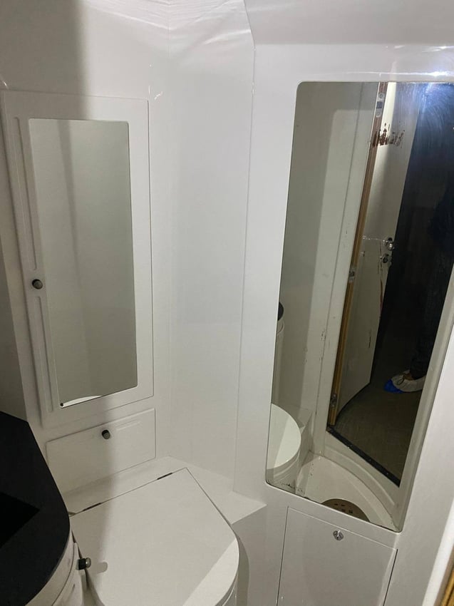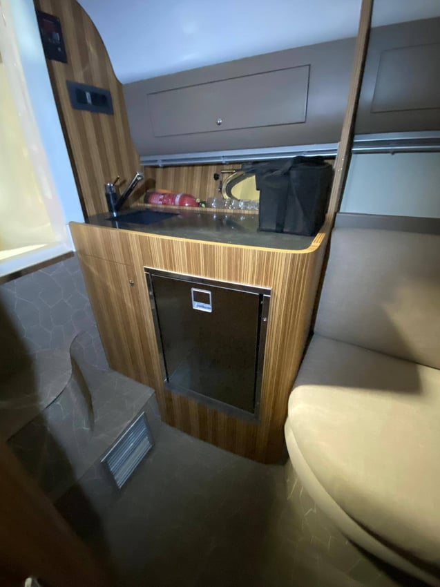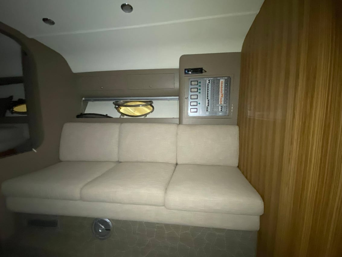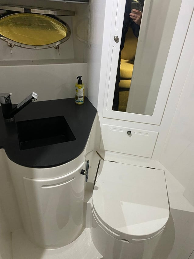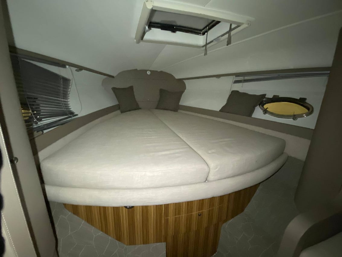 In der Kabine befinden sich zwei gegenüberliegende Sofas, ein zusätzlicher Barschrank mit Spüle und Kühlschrank sowie ein separates Bad mit elektrischem WC, Dusche und Waschbecken. Das für zwei Personen bequeme Bugbett sorgt auch nachts für einen angenehmen Aufenthalt an Bord.