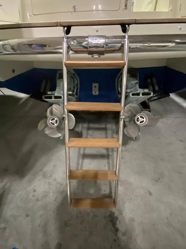 Bequemer Zugang an Bord mit der Badeleiter in der Mitte der Teakholz-Badeplattform.