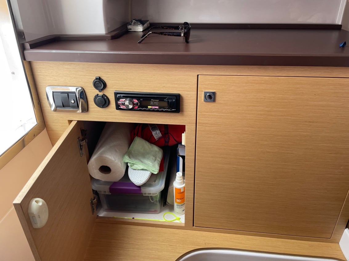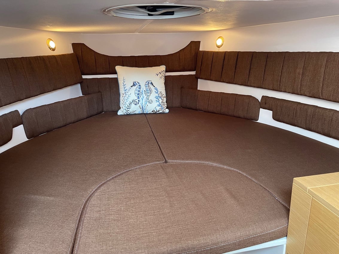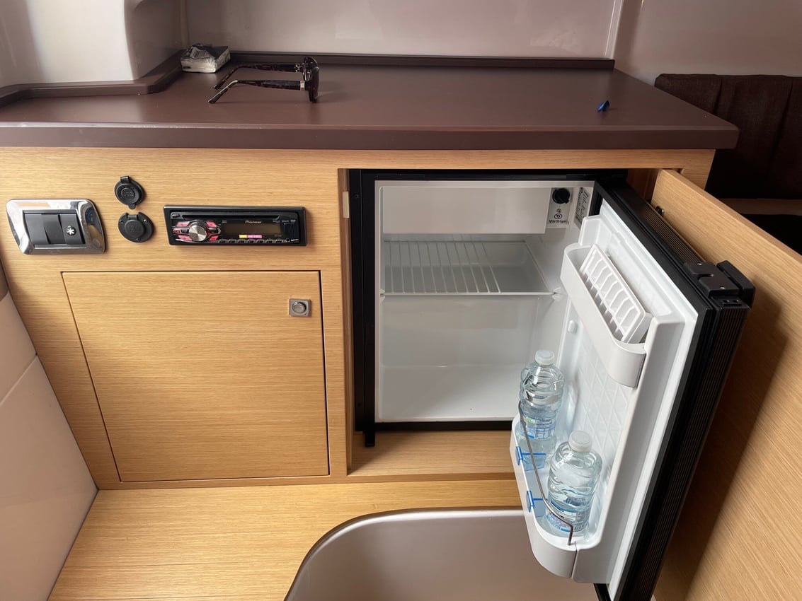 Am Heck ist das Cockpit mit einem Sofa ausgestattet, während sich am Bug ein großes Sonnendeck befindet. Die Kabine befindet sich auf Kopfhöhe und beherbergt zwei Kojen und eine Toilette.