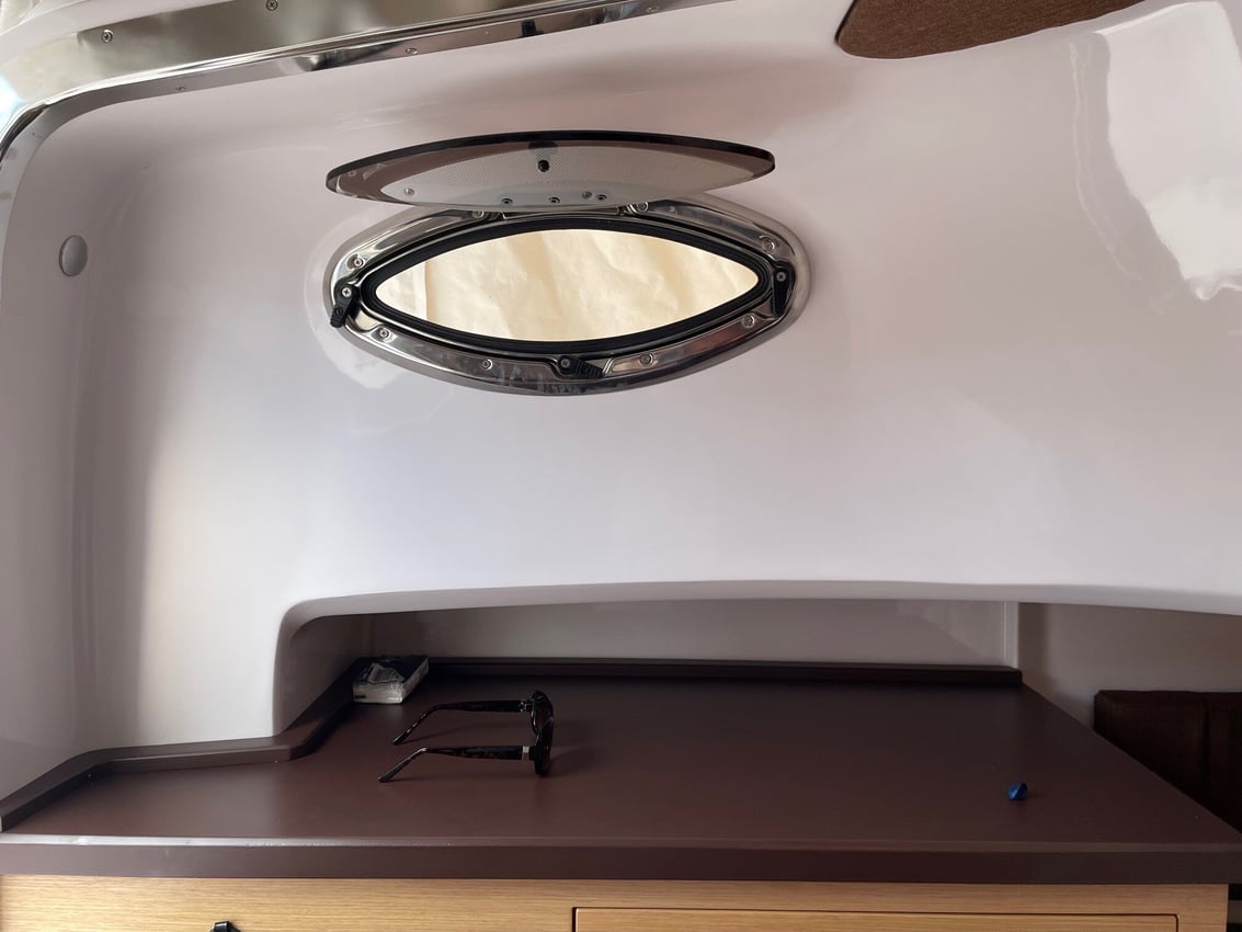 Auf der Mittelkonsole befindet sich auf der rechten Seite der Pilotensitz und auf der linken Seite der Zugang zur Doppelkabine unter Deck. Die Windschutzscheibe bietet einen hervorragenden Schutz für den Piloten und das gesamte hintere Cockpit. Im Armaturenbrett befinden sich zwei Platten, um die Motor- und Systemkontrollinstrumente von den Navigationsinstrumenten zu trennen.