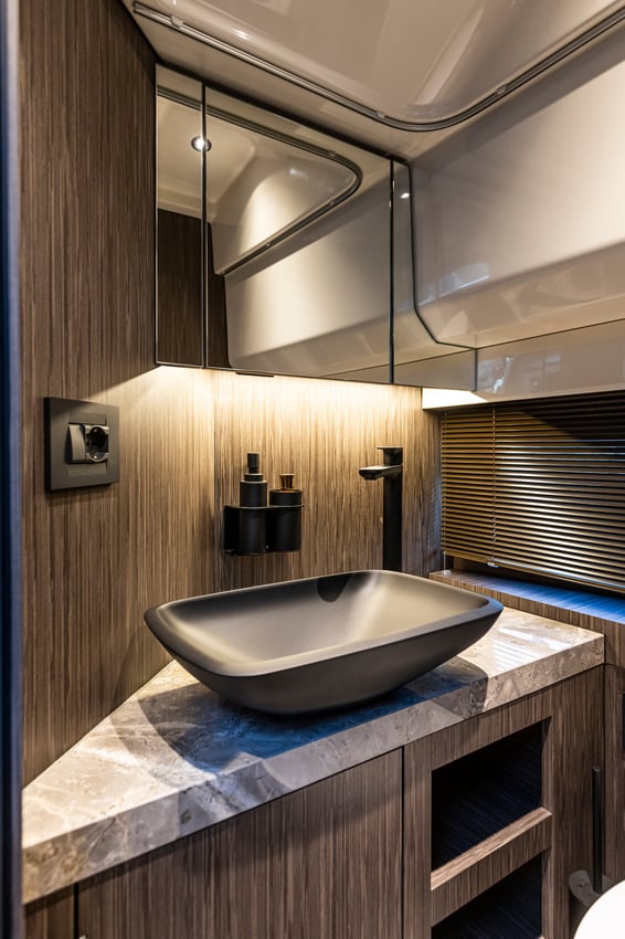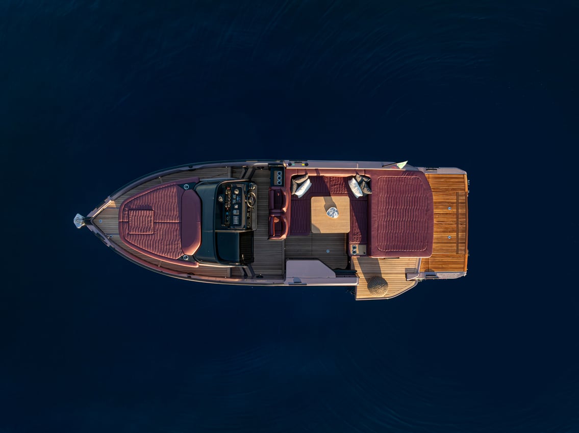 The cockpit features a large C-shaped sofa with a central table that can be lowered to the seating height to create another large sunbathing area. A refrigerator can be installed under one seat, while on the opposite side, the wet bar has a sink and a convenient teak cutting board. There are multiple options for providing shade in the cockpit: two versions with steel poles for the bimini top, another with four carbon poles, or the innovative T-top.