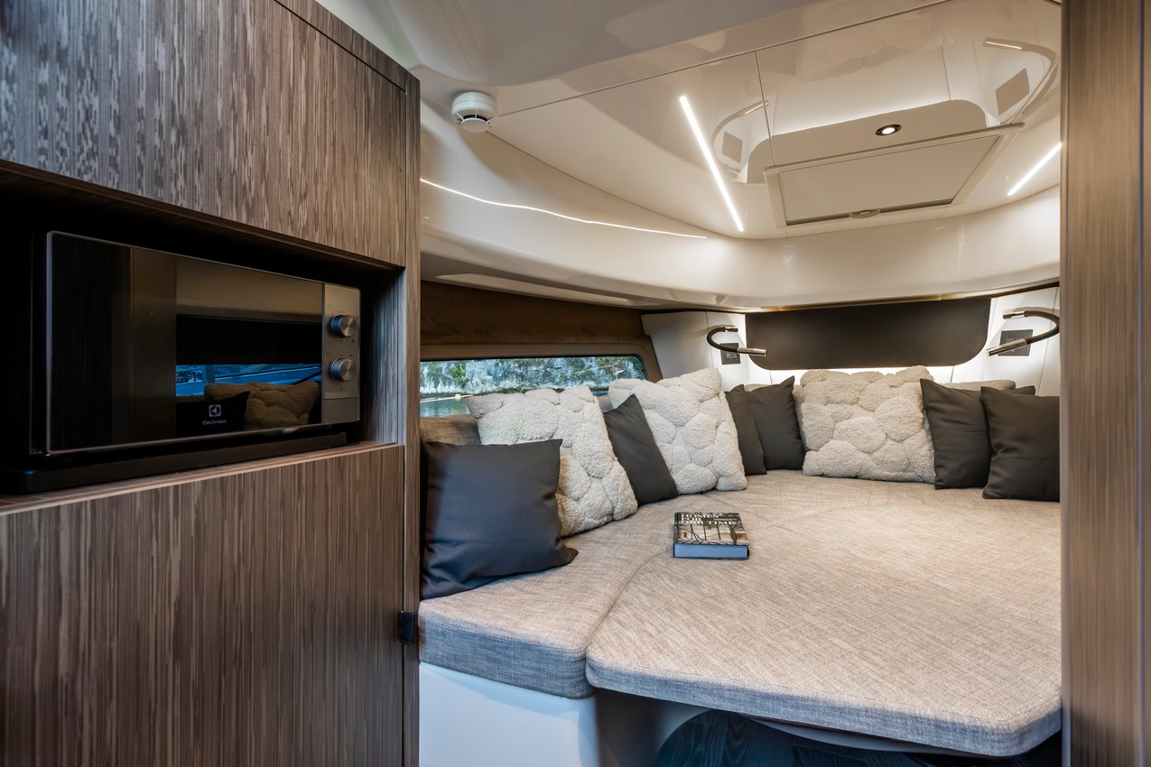 The helm station is elegant, minimalist and high-tech, with perfect visibility. The instruments ensure great safety and control of the boat: joystick, bow thruster, Volvo Penta digital indicators, Garmin display, autopilot and much more.