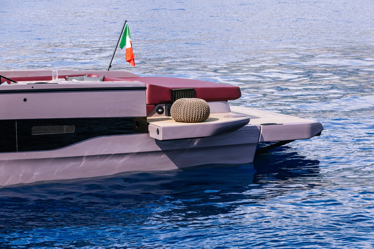 At the stern, the platform is extended and has two storage compartments. Among the options is an electro-hydraulic extension of the central portion of the platform, which transforms into a step into the water and, together with the large sundeck and the fold-down bulwark on the left side, creates a real beach area.