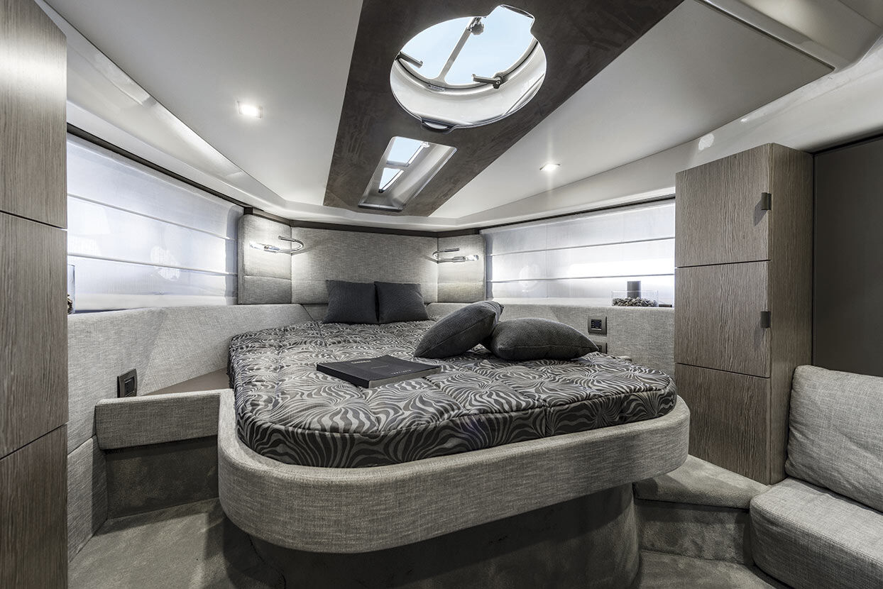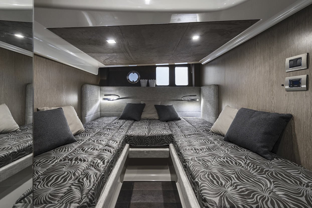 The spaces below deck are well organised and optimally utilised. The cabins are finely furnished, bright and equipped with a bathroom with shower. The aft cabin can accommodate up to three guests, while the main cabin at the bow has a double bed and useful wardrobes.