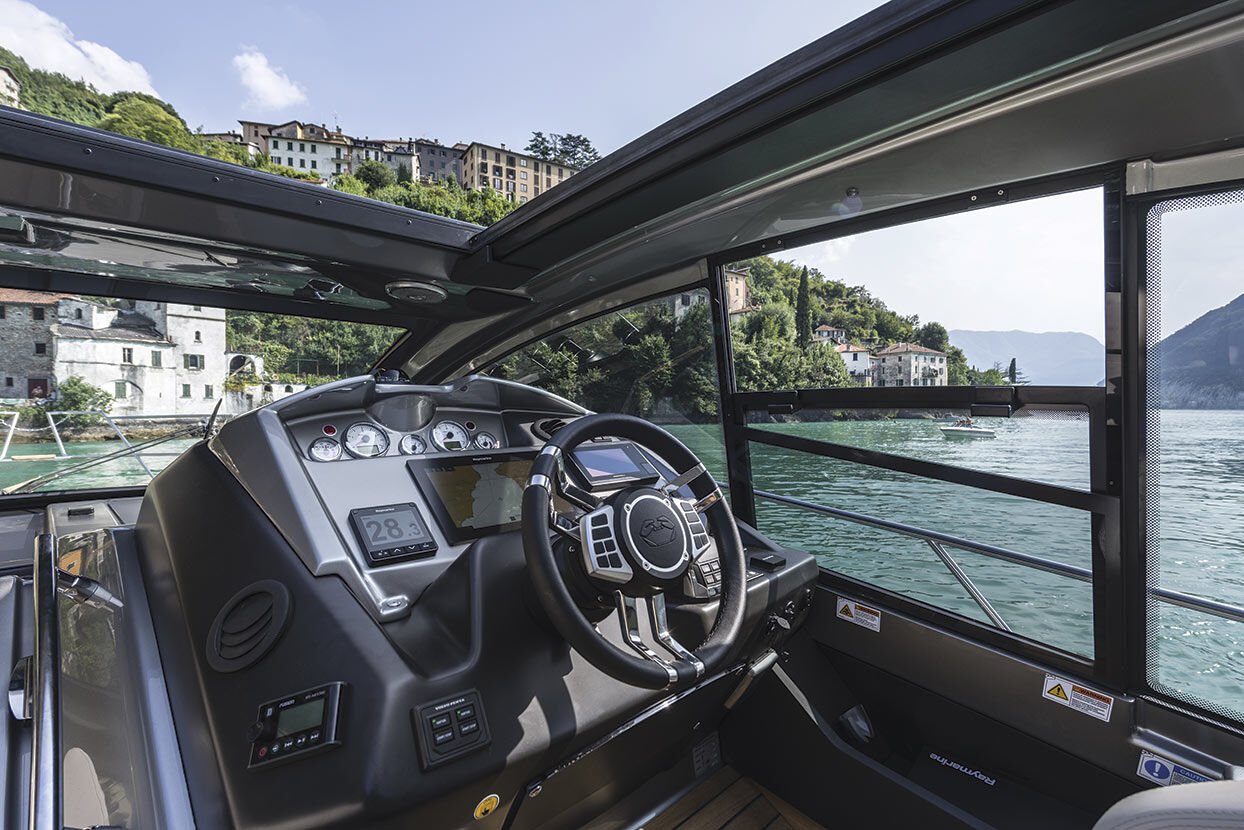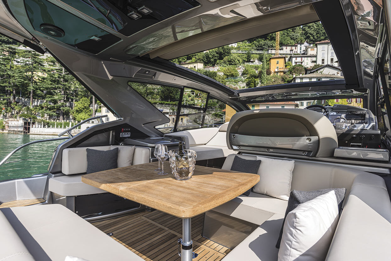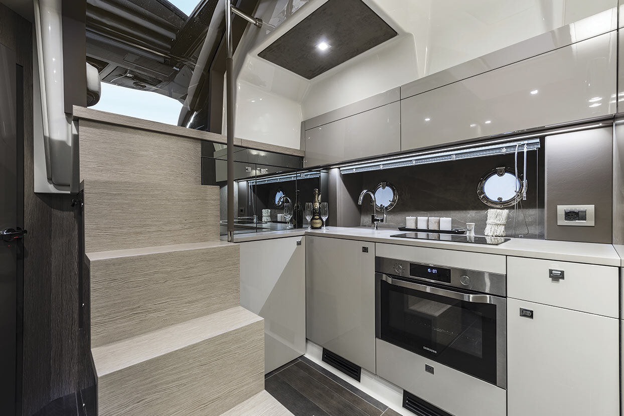 On the starboard side, the dashboard features analogue and digital instruments and an elevated double helm station offering excellent all-round visibility. On the opposite side are the galley and a chaise longue.