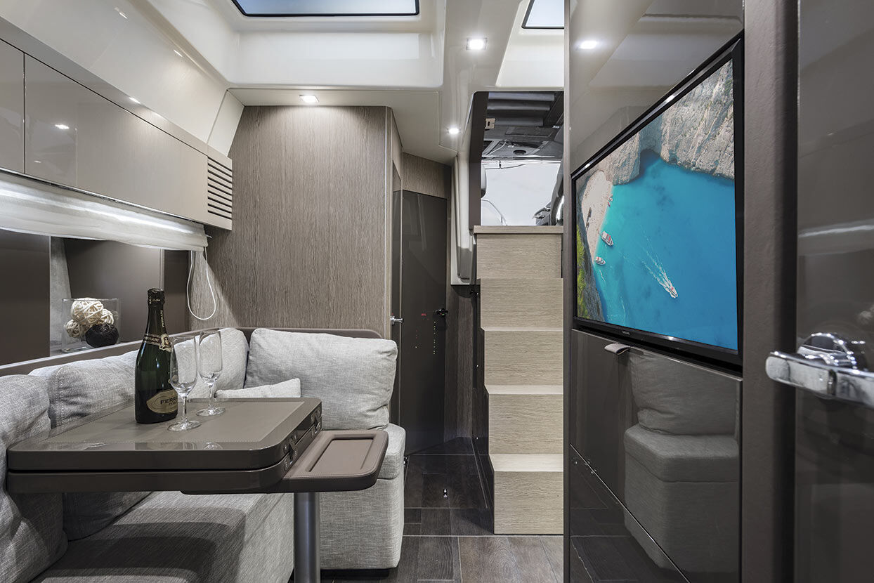 In the dinette there is a comfortable and fully equipped kitchen with a folding table and an L-shaped sofa that can be converted into a bed.