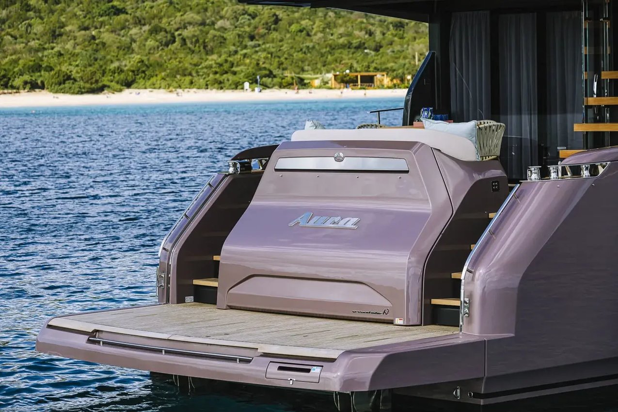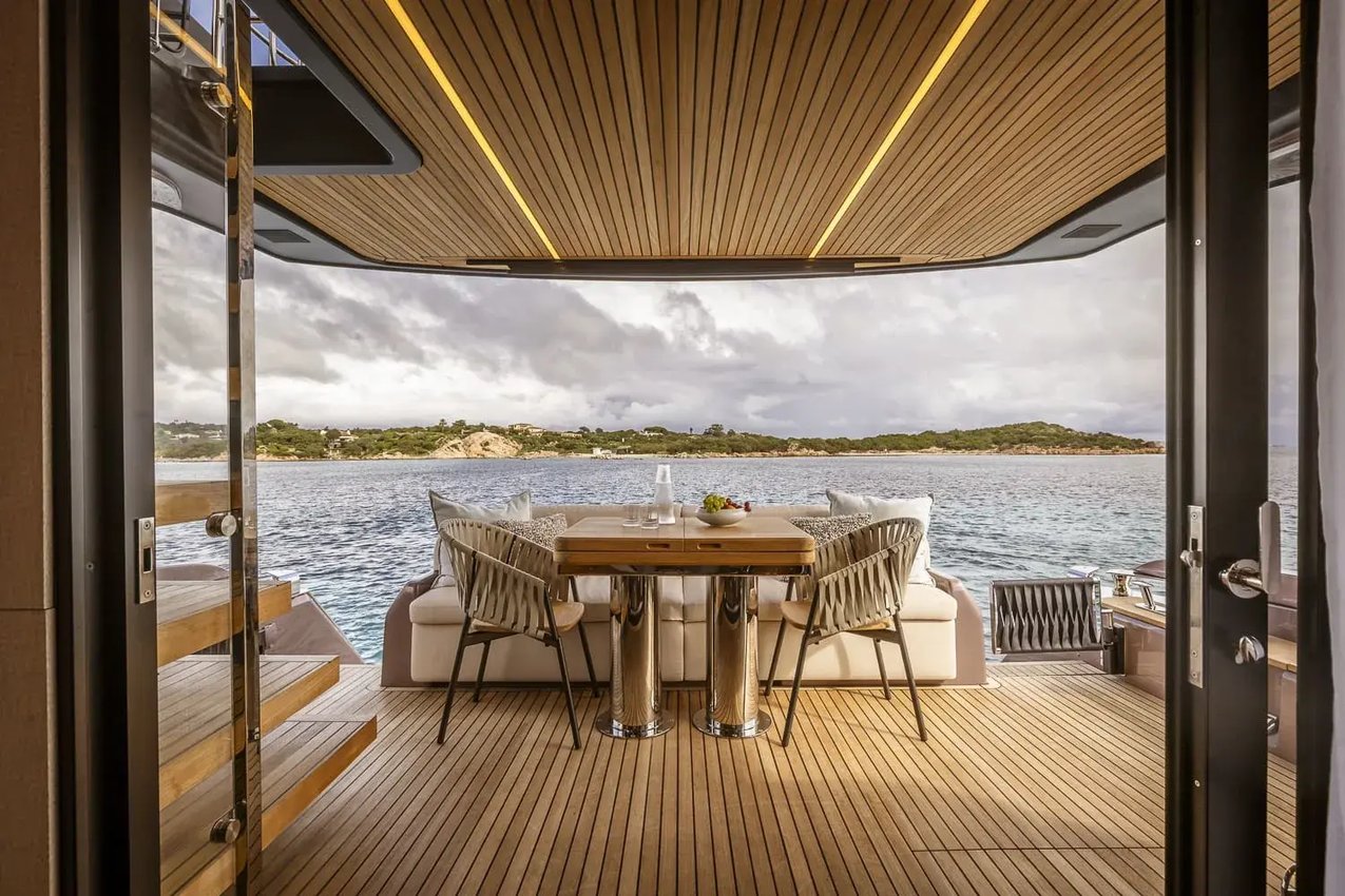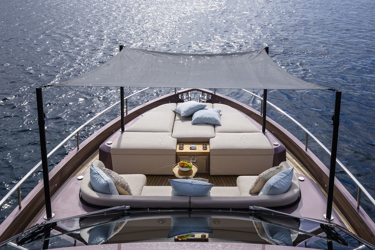 Starting from the stern, the swim platform offers access to the tender garage and to the crew cabin. Walking up the side steps leads to the cockpit, a convivial and relaxing area in continuity with the saloon. Also in the bow we find a lounge area with a large half-C sofa and a large sundeck.