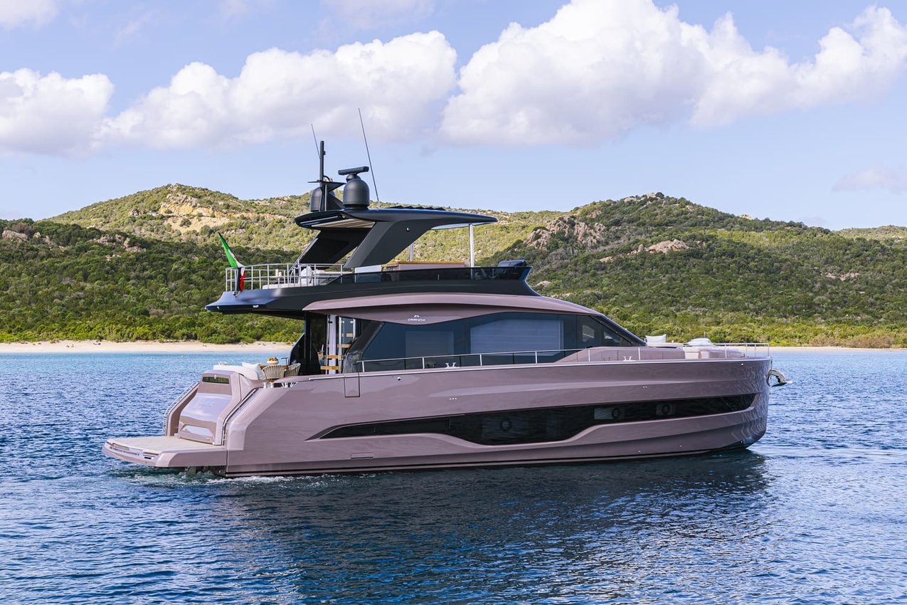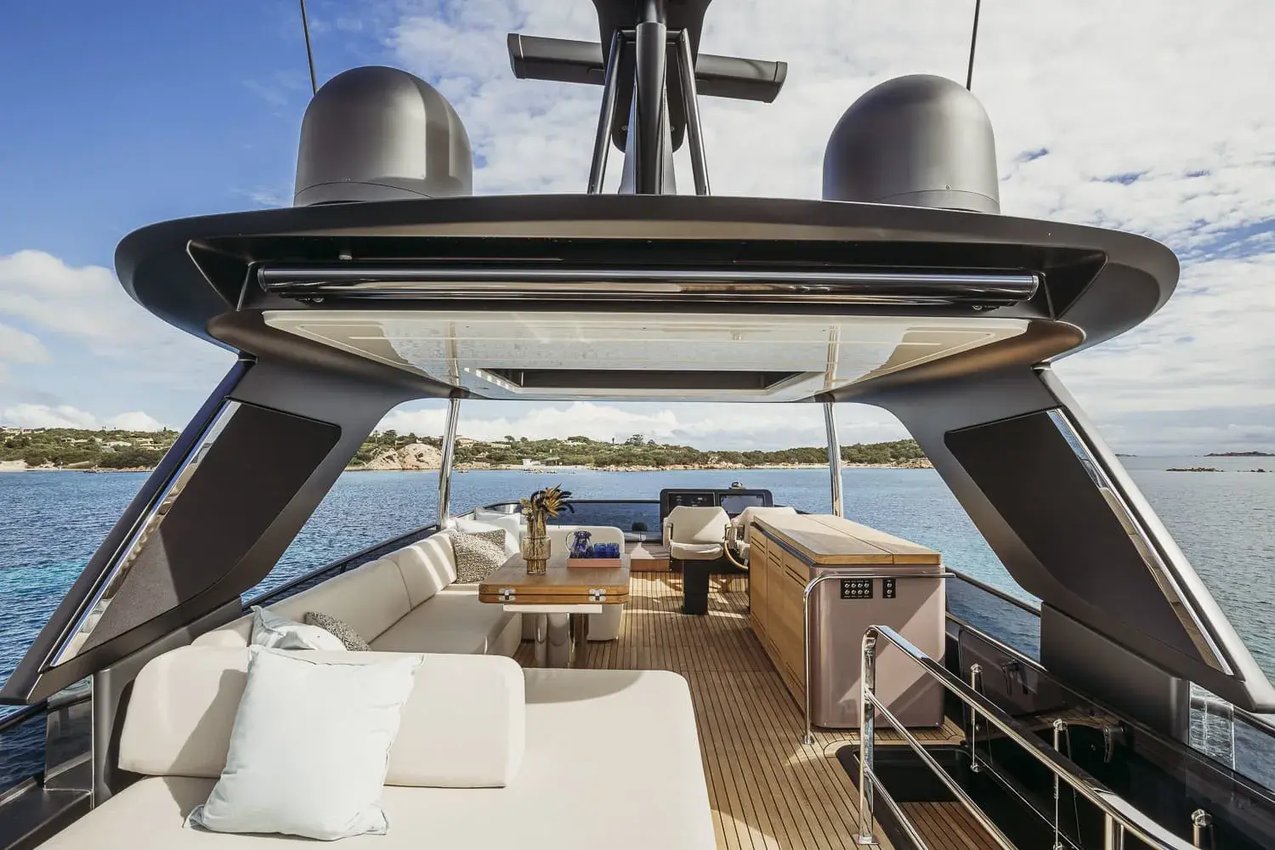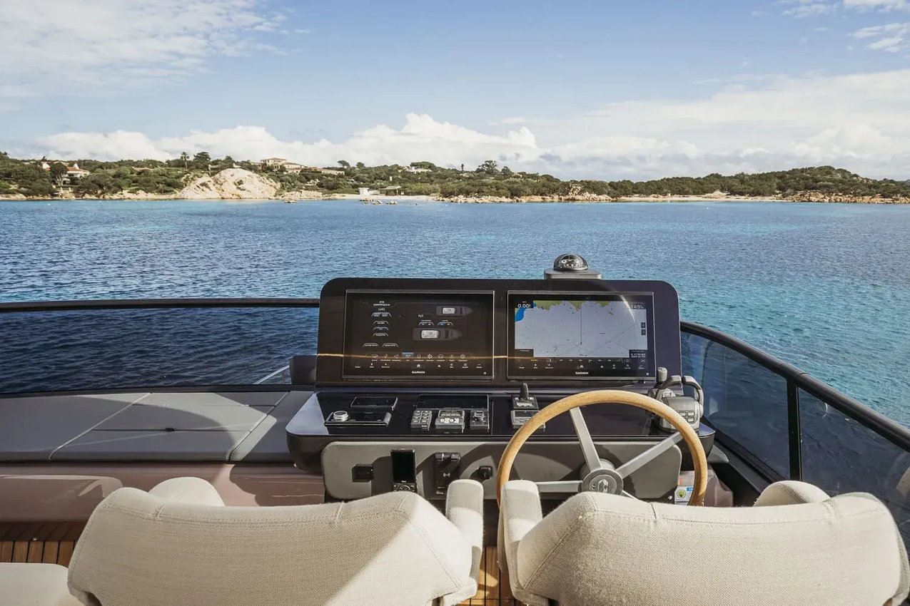 The flybridge dashboard, inspired by the automotive industry, is minimalist and extremely elegant. The flybridge area is sheltered by a very light and strong T-Top, which can be partially opened thanks to an innovative blade system.