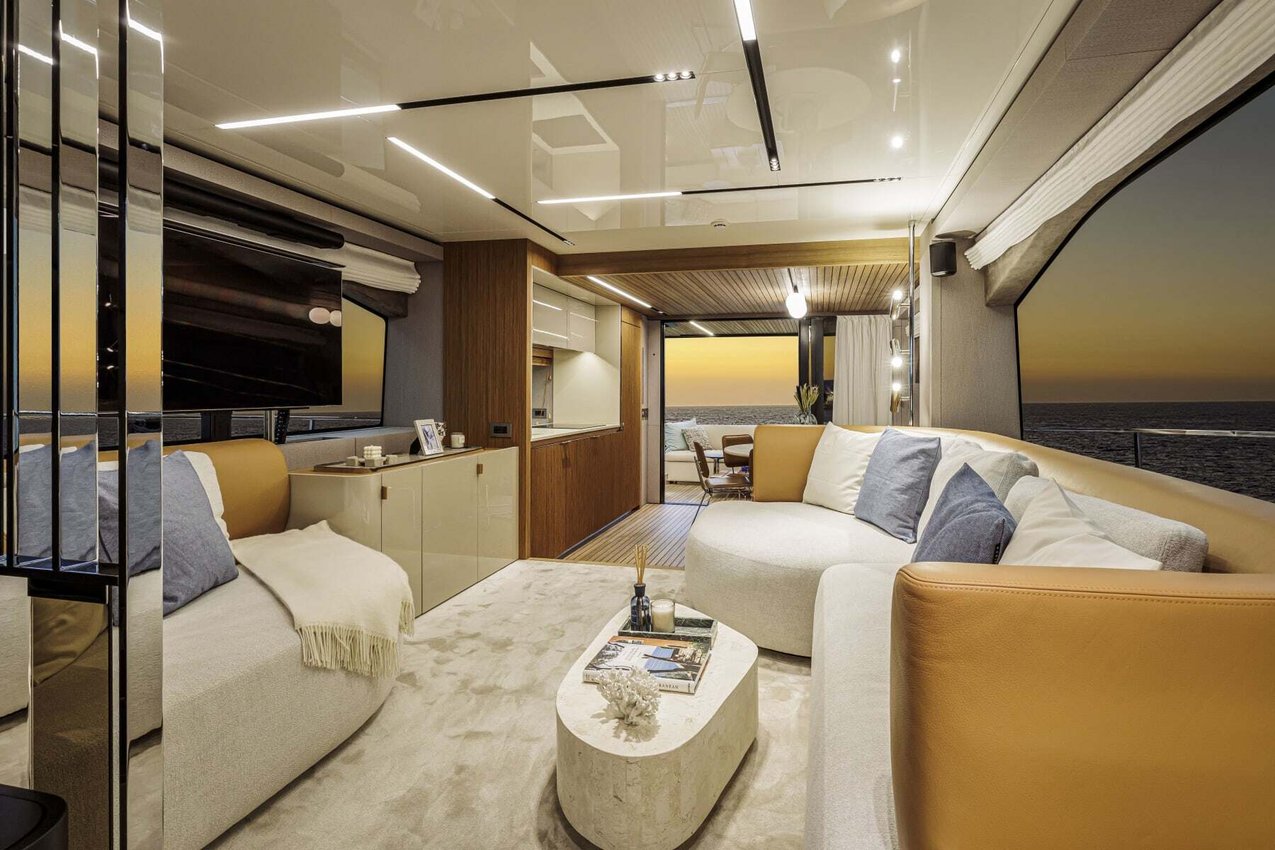 Inside, in continuity with the cockpit, we find the saloon, consisting of the dining room with marble table and full galley and the lounge area with sofas and TV cabinet. Towards the bow, the steering area features a console with state-of-the-art navigation, domotics and entertainment systems.