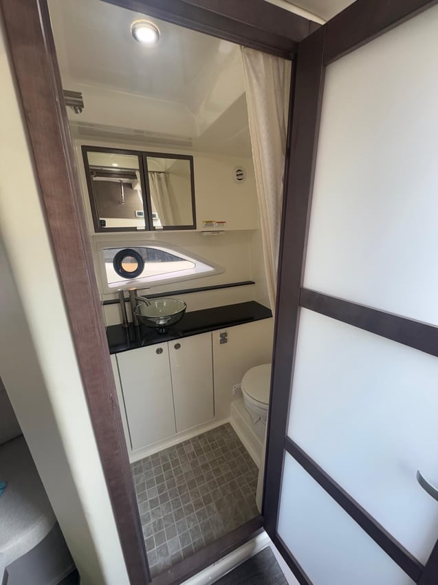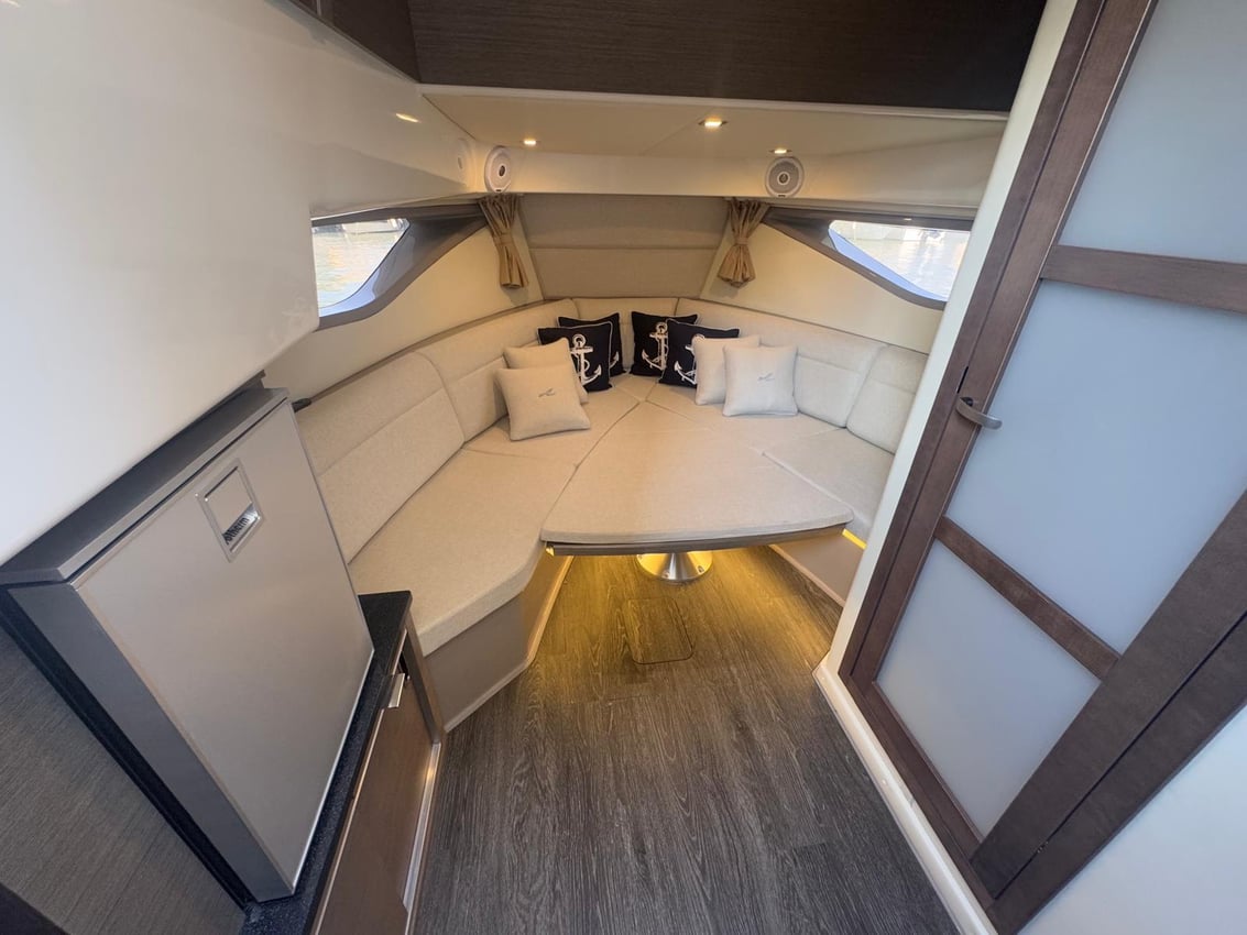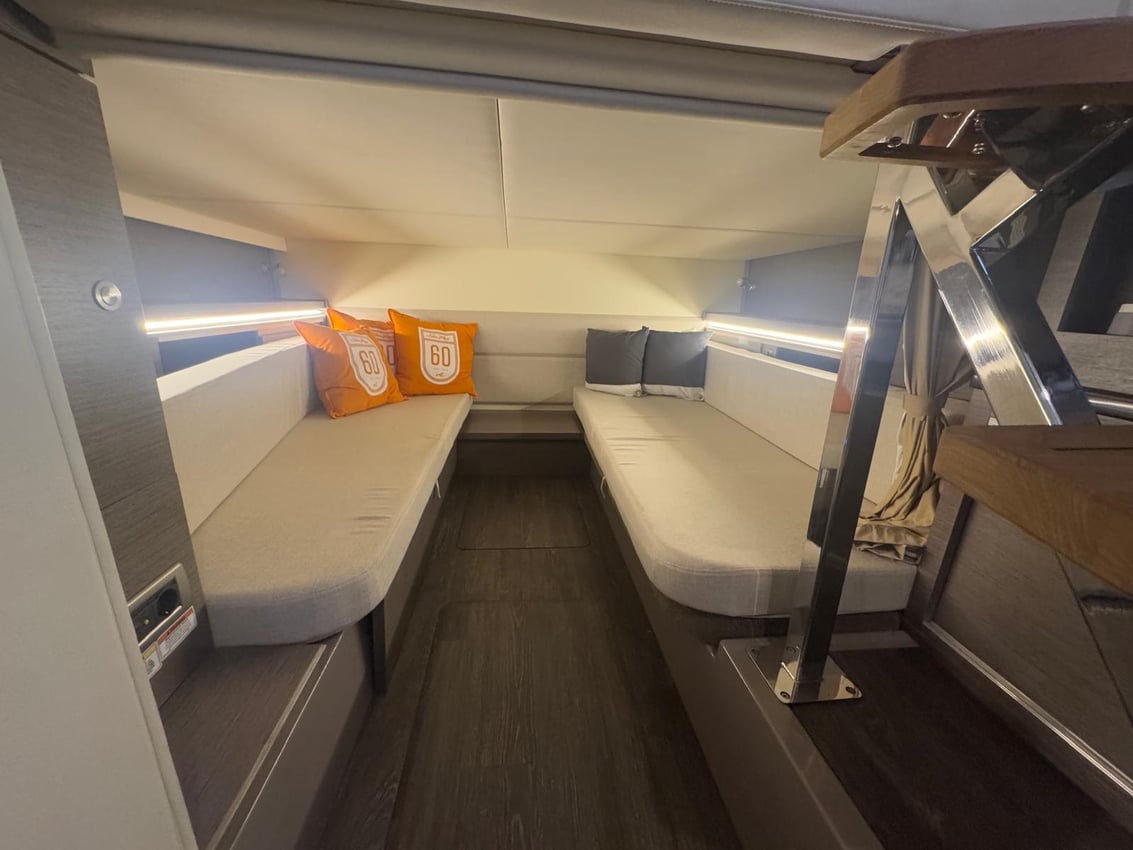 The layout of the interior and exterior spaces is ideal for enjoying days on board with the whole family, thanks to the spacious cockpit and the sun decks at the bow and stern. The cabin features a U-shaped sofa facing the bow, with a table that converts into a bed, a second cabin with two berths, and a separate bathroom with shower. The interior is completed by a fridge and a storage unit.