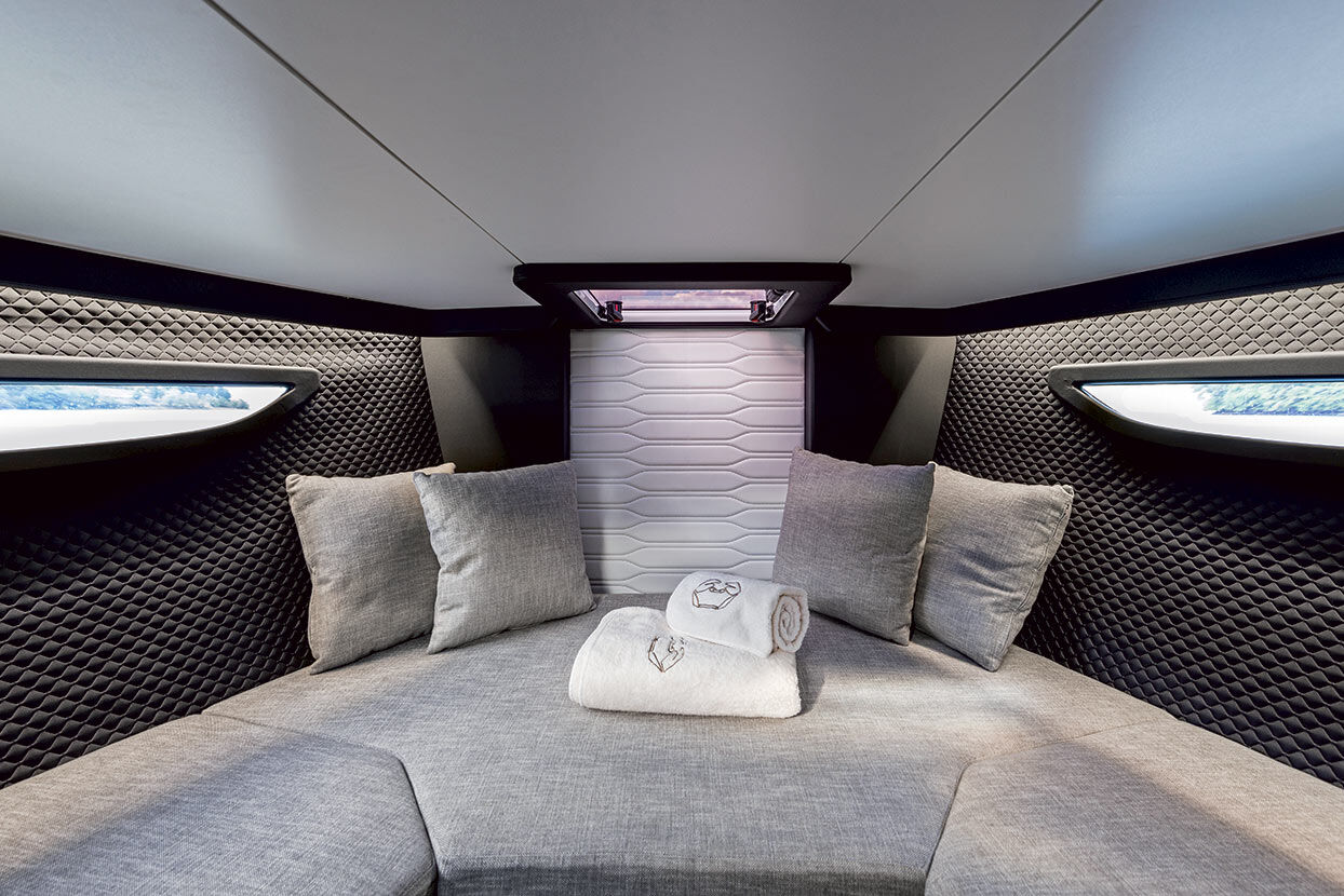 In der Mitte der Windschutzscheibe befindet sich ein praktischer Zugang zum Bug, wo eine weitere große Sonnenliegefläc h e geschaffen werden kann.