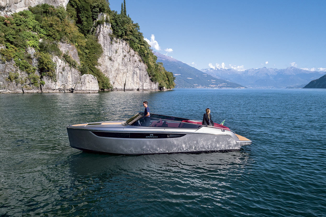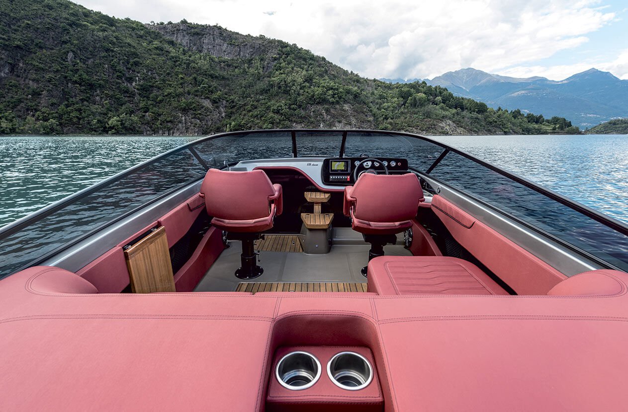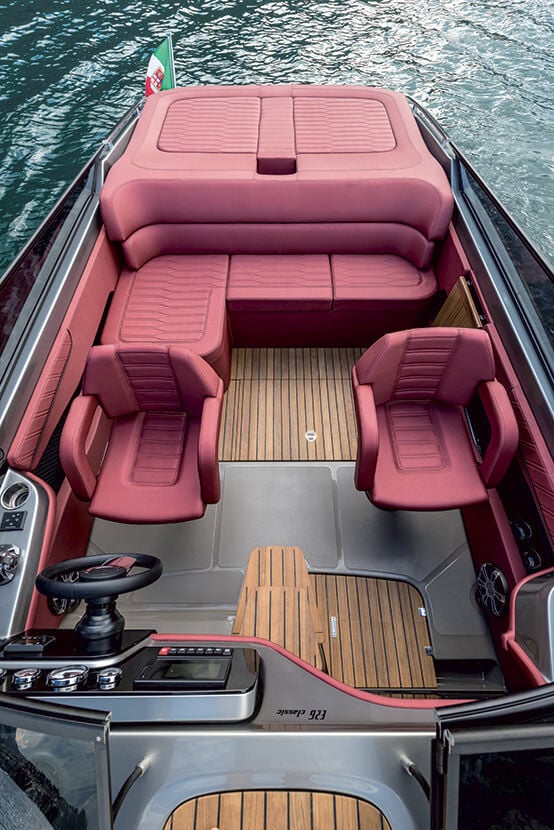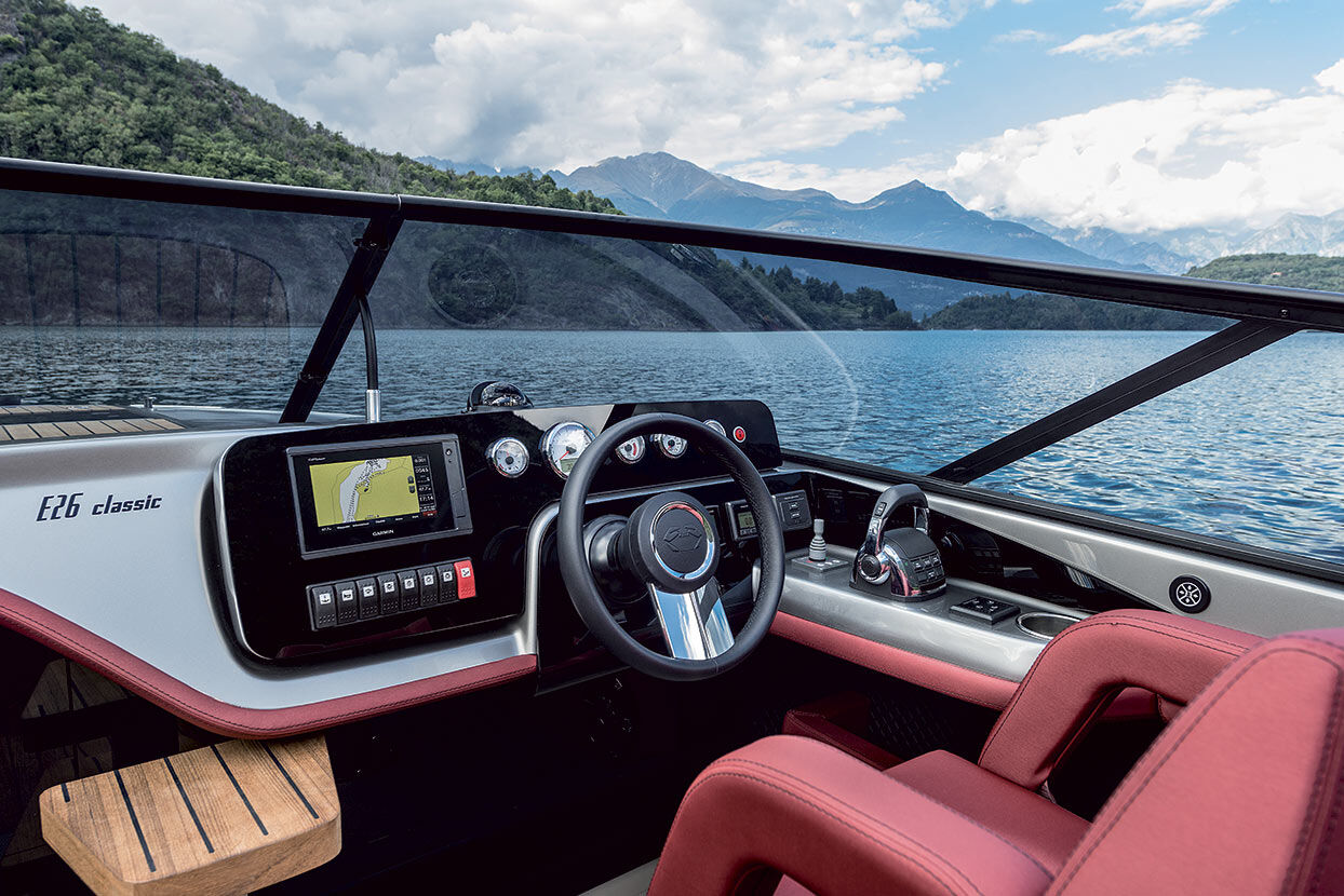 Der vertikale Bug, der das Profil der E26 Classic charakterisiert, vermittelt schon auf den ersten Blick den klassischen und sportlichen Charakter des Bootes, der durch die umlaufende Windschutzscheibe unterstrichen wird.