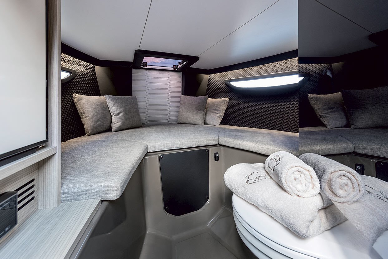 Der Komfort beginnt mit dem großen Sonnendeck am Heck, das den Motorraum überdeckt und in dem sich auch ein einziehbares Bimini befindet, das bei Bedarf Schatten für das Cockpit bieten kann.