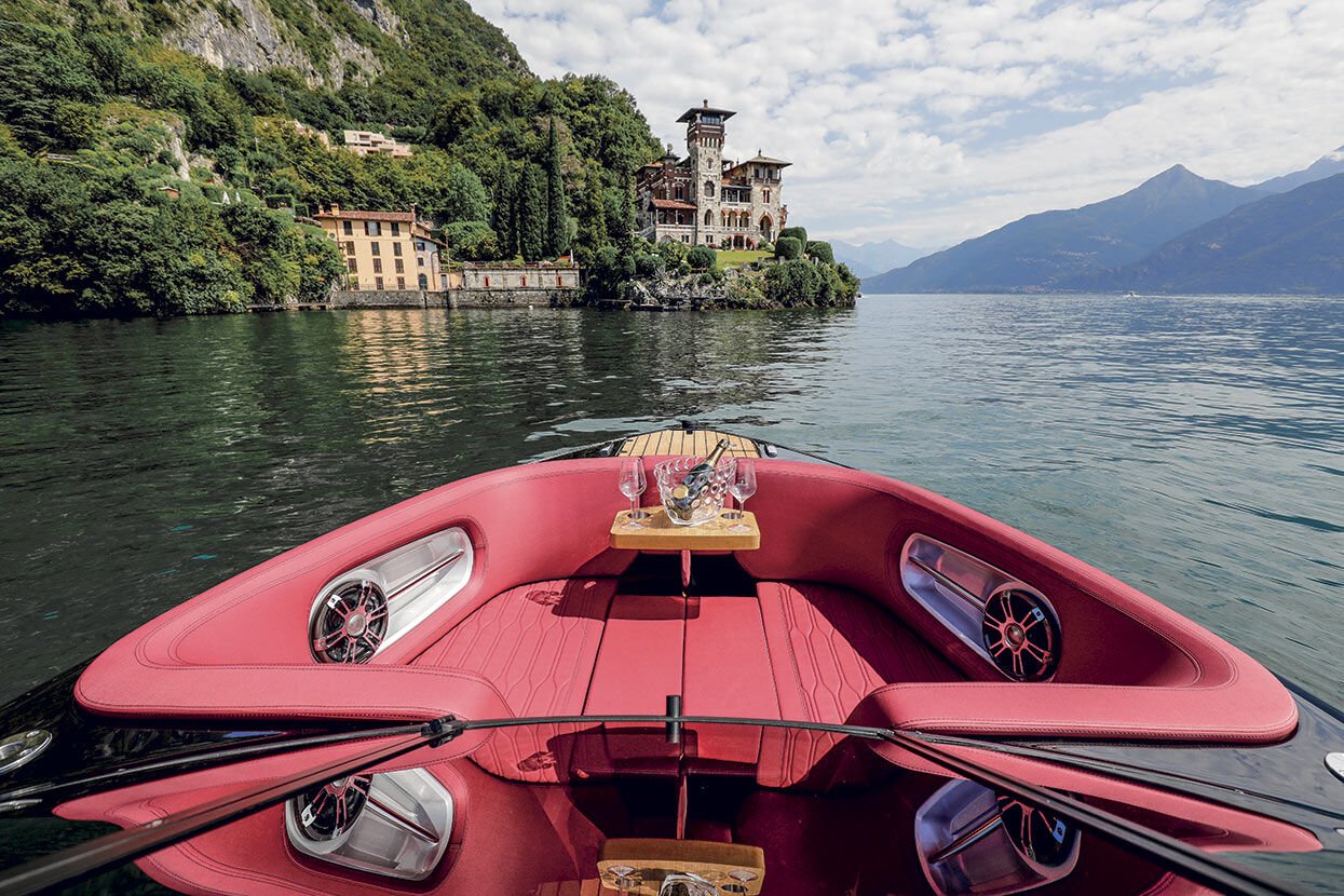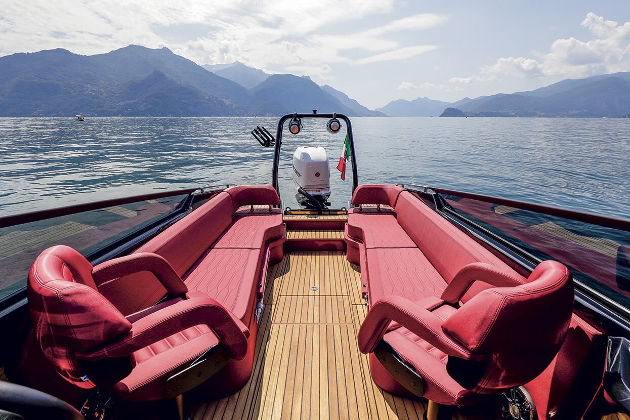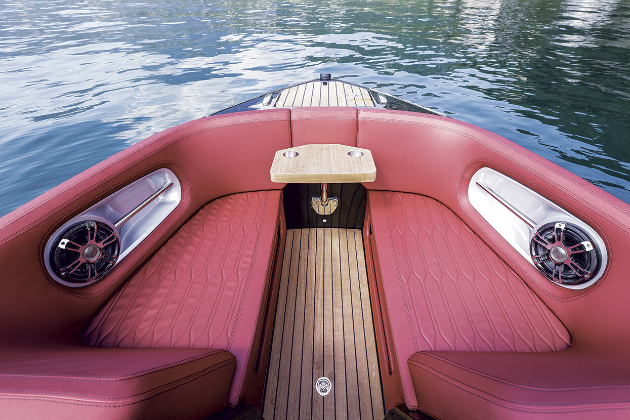 Der Bug ist durch die Öffnung in der Mitte der Windschutzscheibe, die während der Fahrt geschlossen werden kann, leicht zugänglich. Die zwei gegenüberliegende Sofas und der Tisch mit Getränkehaltern bilden einen sehr komfortablen Lounge-Bereich, der mit zusätzlichen Kissen erweitert werden kann.